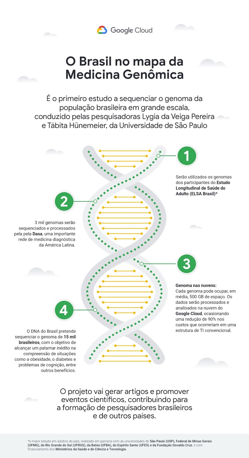 Com experiência na área de processamento e análise de grandes volumes de dados genéticos, por meio do Cloud Life Sciences, o Google Cloud oferecerá ao projeto DNA do Brasil recursos de armazenamento, compartilhamento e análise avançados do primeiro lote de 3 mil genomas, se tornando um importante apoiador desse novo capítulo da ciência brasileira e da jornada para desvendar o genoma humano.